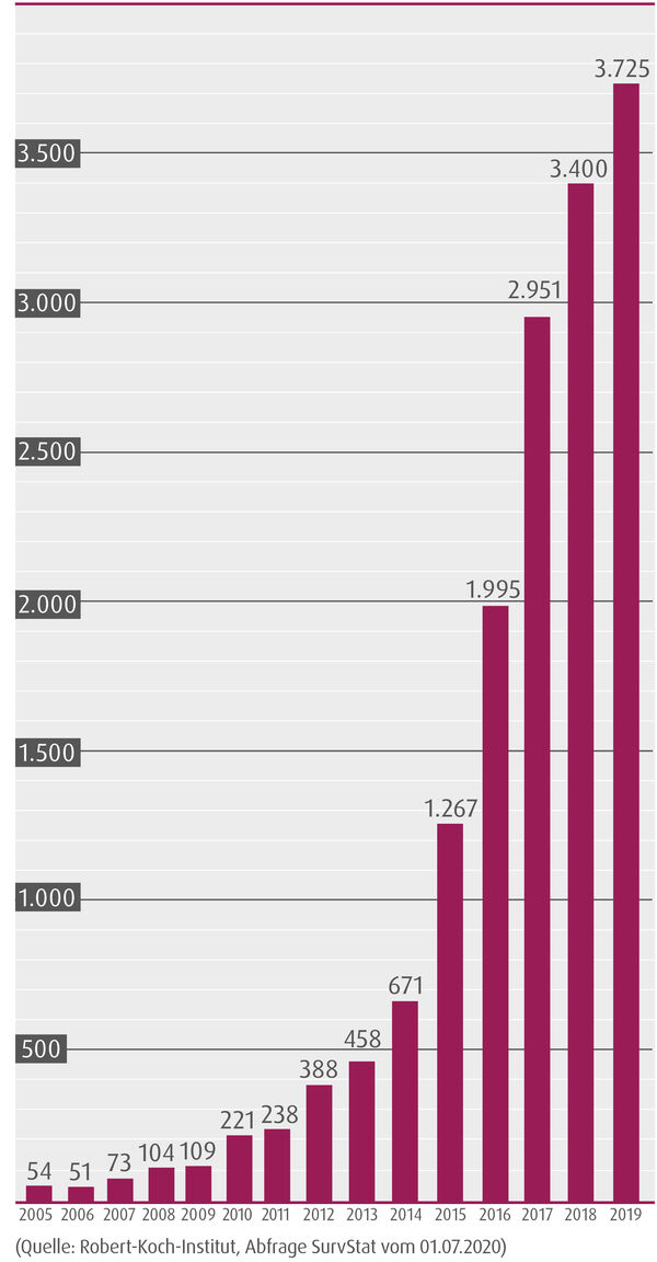 - Risikofaktoren: Verzehr von Wildschwein und Innereien, Metzger etc.