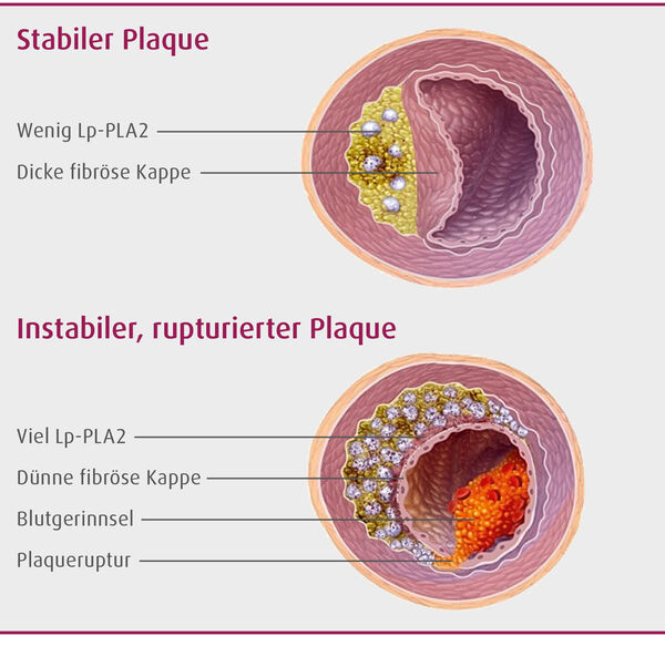 Die Lipoprotein-assoziierte Phospholipase A2 (Lp-PLA2) zeigt, als gefäßspezifisches Entzündungsenzym unabhängig von systemischen Entzündungsvorgängen im Körper an, ob sich in den Gefäßwänden instabile, rupturgefährdete Plaques befinden. Mithilfe des sogenannten PLAC®-Tests, der die Aktivität der Lp-PLA2 ermittelt, kann neben dem Risiko für Herzinfarkte auch das Schlaganfallrisiko abgeschätzt werden.